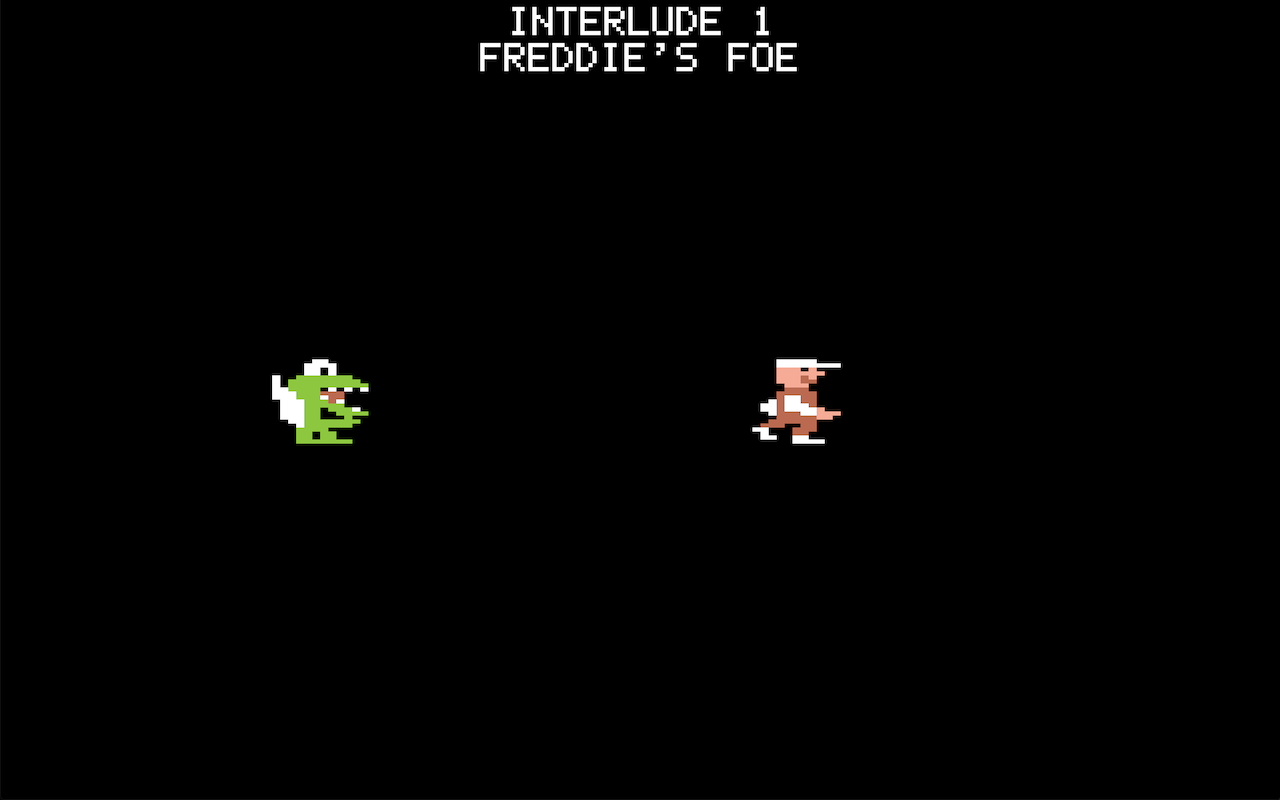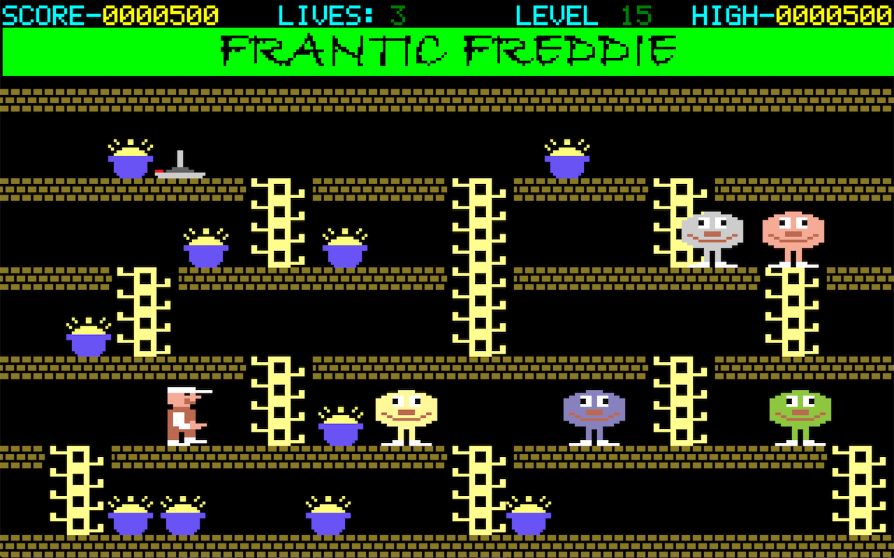 The goal of the game is to have Freddie collect all the pots of gold on each level while avoiding all of the enemies. Optionally collect bonus items to earn more points (10,000 points earn an extra life). When all pots have been collected on a level, you will advance to the next level. What makes the game unique, is that the platforms are connected with telephone poles instead of ladders and Freddie cannot walk past a pole. He must climb up one side and down the other. Enemies however can move past the poles! There are 16 levels of increasing difficulty, featuring different enemies on each level. The earlier levels feature 3 enemies each and the later levels have 4 and 5 enemies. Enemy speed increases gradually each level. Every two levels there are interludes to give the player a short rest.