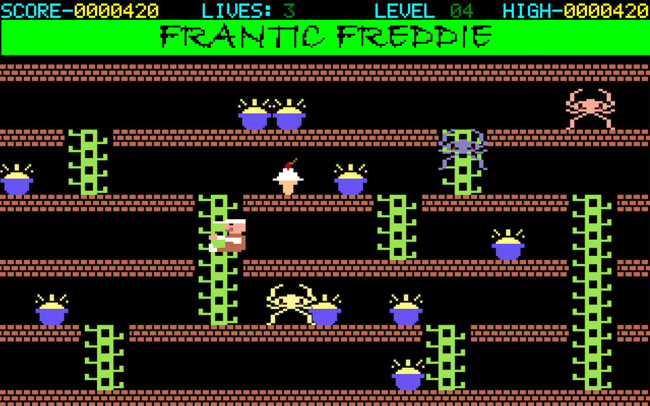 This game is a remake of the game "Frantic Freddie", originally released in 1983 for the Commodore 64. The original game was created by Kris Hatlelid and Gregor Larson, distributed by Commercial Data Systems, Ltd. Frantic Freddie was one of the first platform games ever made.